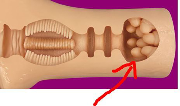 마지막 돌기가 이렇게 솟아 있어 페니스 끝부분을 간질이는 듯한 자극을 줍니다. 안쪽에서 빙글빙글 돌리며 돌기 촉감을 즐길 수도 있지만 살짝 간지러운 느낌과 함께 엉덩이가 움찔할 정도라서 스트로크 중 끝부분이 가볍게 닿는 정도가 가장 편안했습니다.