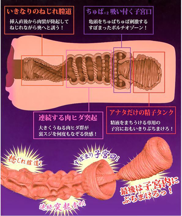입구에 살짝 더해진 나선형에 가까운 사선 주름의 닿는 감각이나 중앙 주름 존의 탱글한 느낌은 물론, 마지막의 자궁 존을 연상시키는 걸림감도 분명하게 느껴집니다.