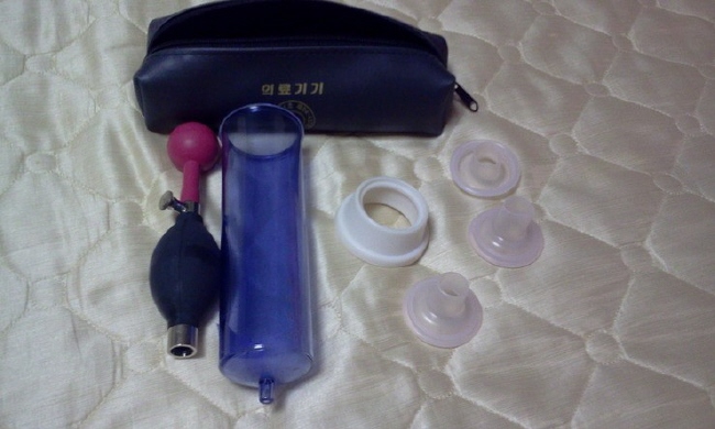 내용물을 주사기 비슷한 원통 이하 실린더, 공기를 빼주는 기구 이하 스포이더, 고무밴드등이 내용물이고요!
