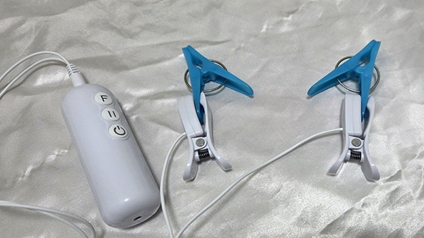 진동이 강하기 때문에 저는 이런 식으로 클립에 빨래 집게를 끼워서 유두를 집는 방식도 괜찮겠다고 생각했습니다♡