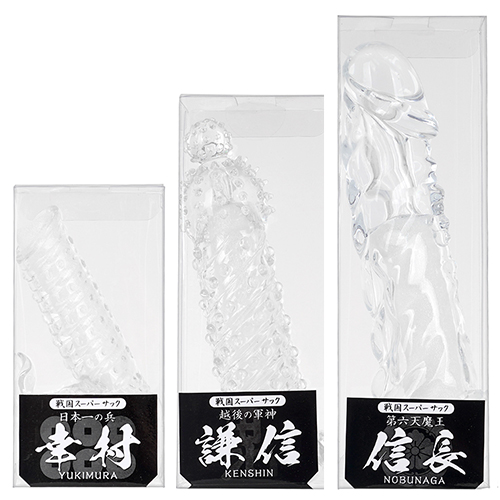 전국 시대에 활약한 영우들처럼 거친 남성이 되어라! 파트너에게 강렬한 자극을 주는 돌기와 주름, 곡선 구조에 고환을 조이는 서포트 설계까지 고안된 3종류의 특수콘돔 시리즈, "전국 슈퍼 슬리브".