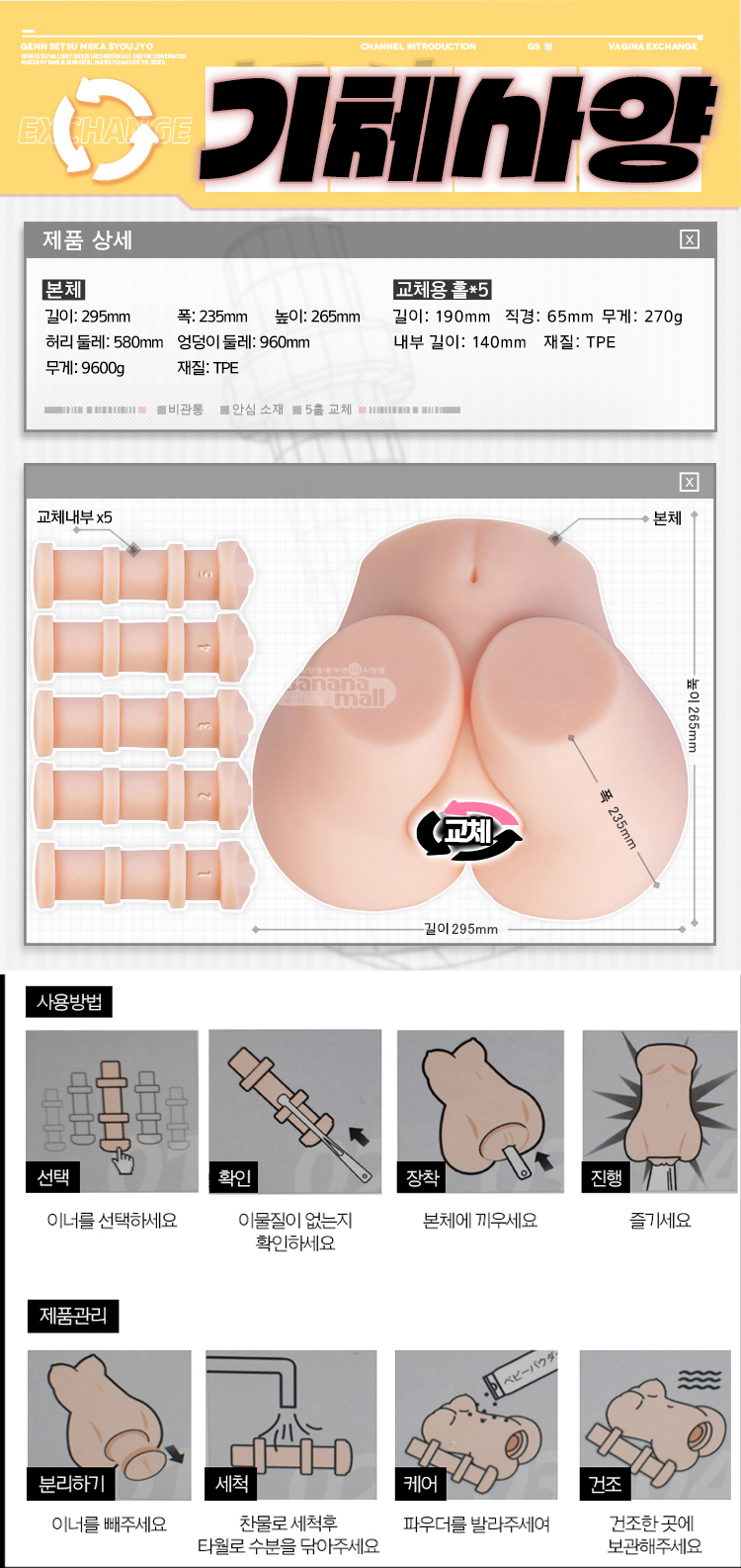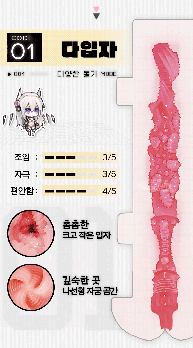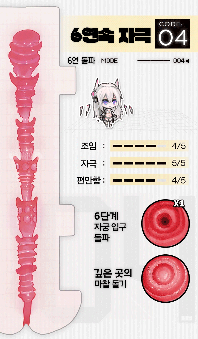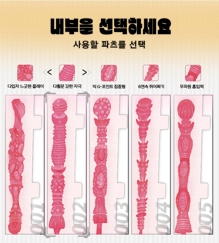5가지의 내부 홀을 교체하여 그날그날 기분 좋은 자극과 오르가즘을 즐길 수 있습니다.
