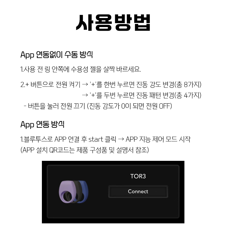 • 용품 사용시 꼭 콘돔을 사용하시길 바랍니다. 위생과 청결뿐아니라 제품의 수명에도 도움이 됩니다.