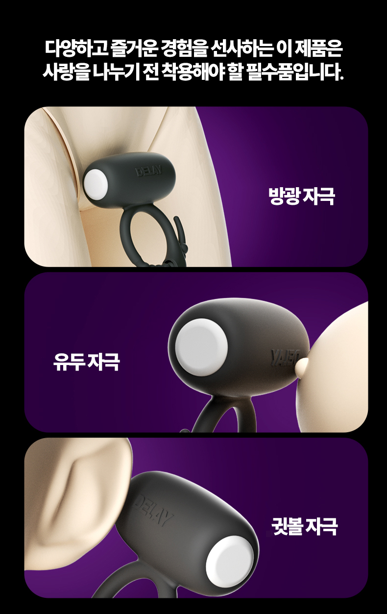 사정 지연과 발기 유지에 도움을 주며, 진동 자극을 더해 파트너에게까지 전달되는 삼중 효과를 제공합니다.
