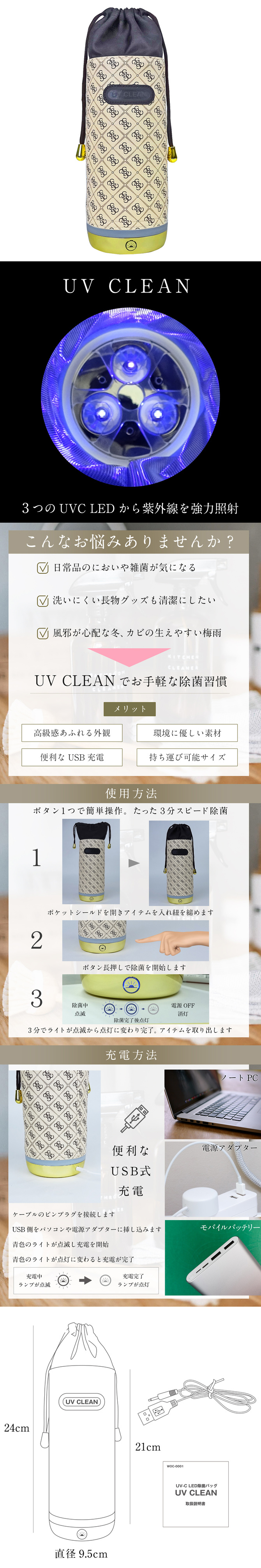 3개의 UVC LED에서 가방 안으로 자외선(UV-C)을 강력 방사, 단 3분 만에 클린하게!