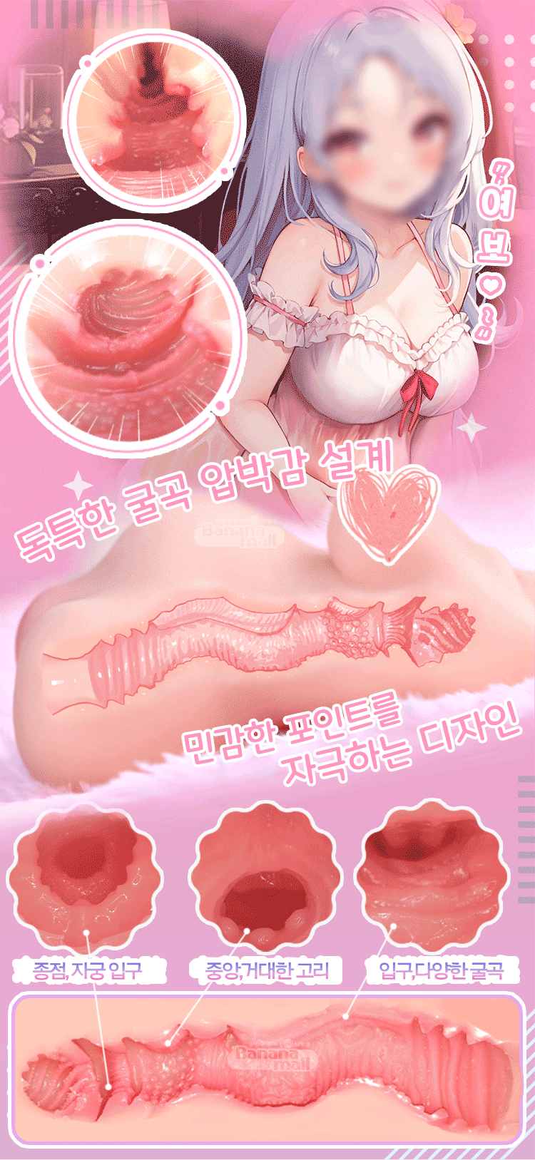 시작 부분이 굴곡지게 구성되어있어서 삽입할 부드럽고 꿀렁하며 들어가는 부분은 압박도 어느 정도 줘서 좋습니다. 다만 그 이후 중앙 거대 고리 구간을 지나는 구간과 굴곡과 내경이 거의 차이가 없어서 '아 이거다' 싶은 자극은 거의 없었습니다.이 부분부터 이후 구간들을 제대로 느끼려면 손으로 꽉 잡아서 압박을 해줘야하는데, 중간 부분은 배꼽을 꾹 누르면서 해줘야 합니다.자궁입구 부분이라는 구간 또한 꽉 잡아야만 겨우 느껴지는 그런 형태로 되어있습니다.설계 미스인진 모르겠습니다만 잡게 되면 외형상 자연스럽게 쇄골/밑 가슴으로 손이 잡히게 되는데그렇게 되면 종점 직전 부분을 압박하게 되서 정작 종점 부분의 자극을 느끼기 쉽지 않습니다.잡는 방법을 엄지로 가슴 아래쪽에서 살짝 위, 명치를 향해 누르는 손잡기가 되어야 종점 부분을 제대로 느낄 수 있게 되어있습니다.제대로 즐기려면 내부 구조에 대한 이해를 바탕으로 잡는 방법이 제한적인 물건입니다.