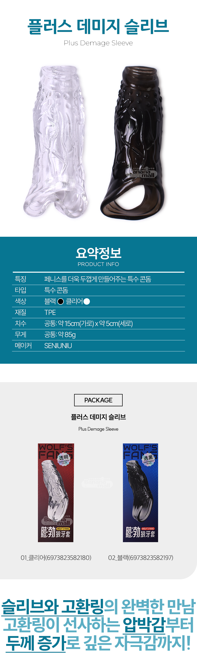 슬리브와 고환링이 일체형으로 설계된 콘돔 타입 제품입니다.