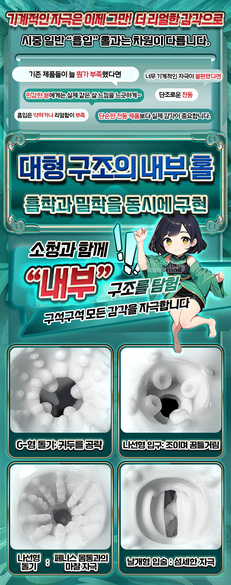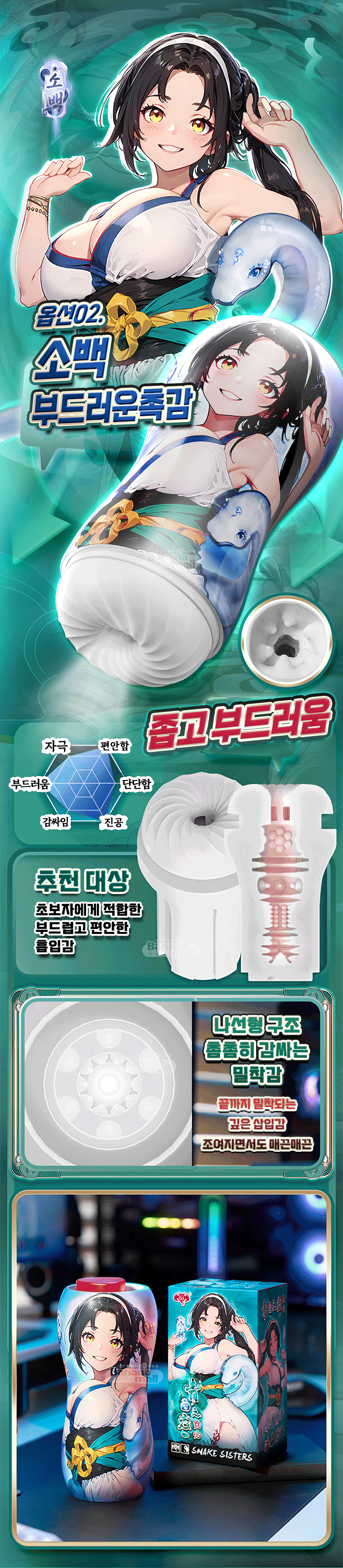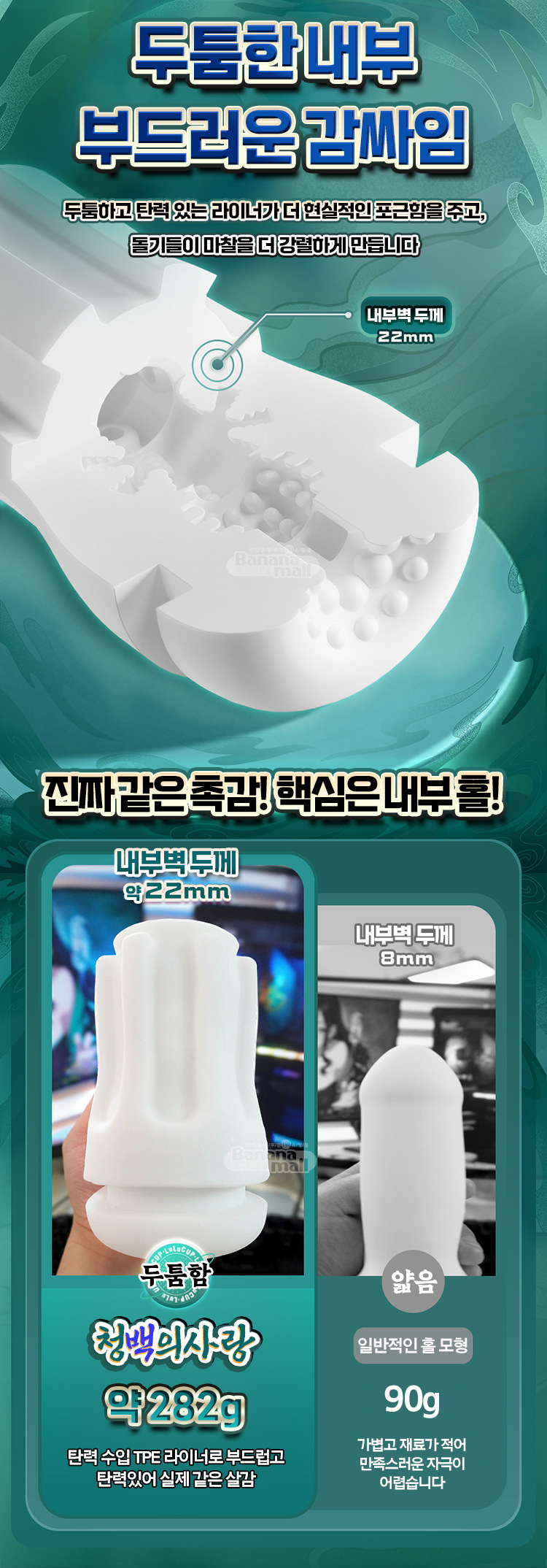 두껍고 부드러운 내부 홀이 페니스를 빈틈없이 조이며 자극해 황홀한 자극을 선사합니다.