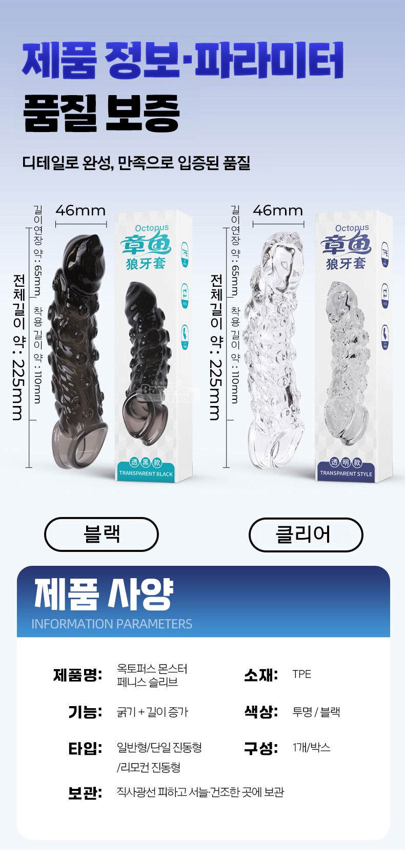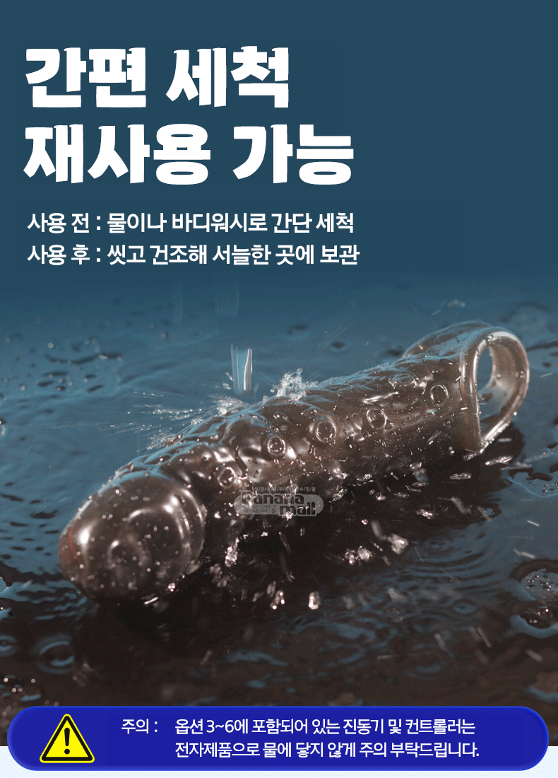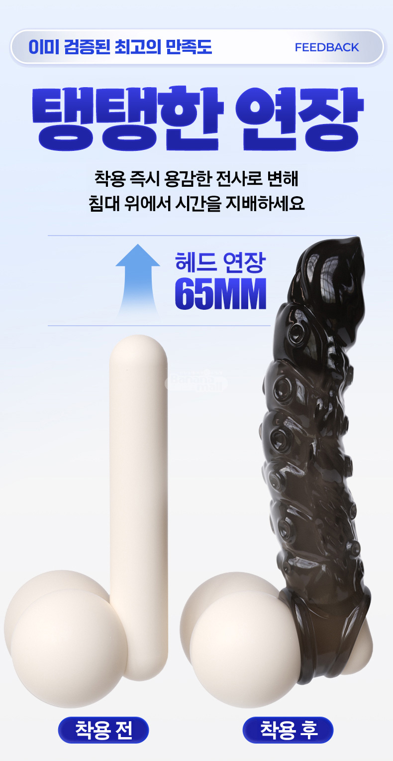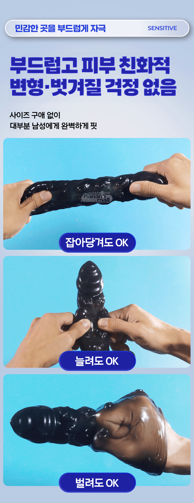 탄력적인 실리콘 재질로 페니스를 꽉 쥐여주며 이질감 없는 착용으로 사이즈 확장과 사정 지연을 돕는 특수 콘돔입니다.