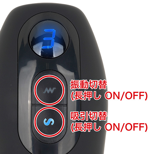 • 각 7종류의 진동, 진공이 패턴 탑재되어 있습니다. 위쪽의 진동과 아랫쪽의 진공 버튼은 각각 조작이 가능해, 누를 때마다 각 기능의 패턴이 변경됩니다. 길게 누르면 기능이 On/Off 됩니다.