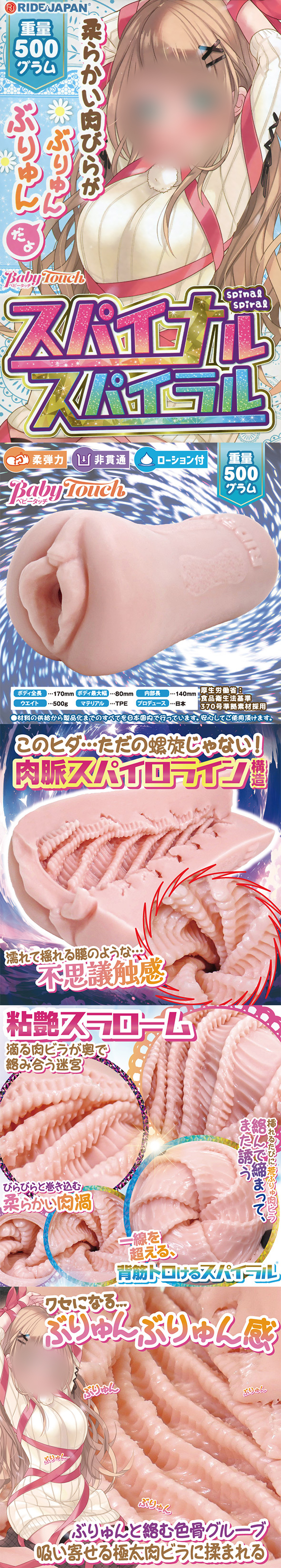 삽입구의 형상은 일단 질 구조이지만, 뭔가 다소 불균형해 보입니다. 스파이럴 주름과의 궁합이 뛰어난 베이비 터치 경도 밸런스가 돋보입니다.
