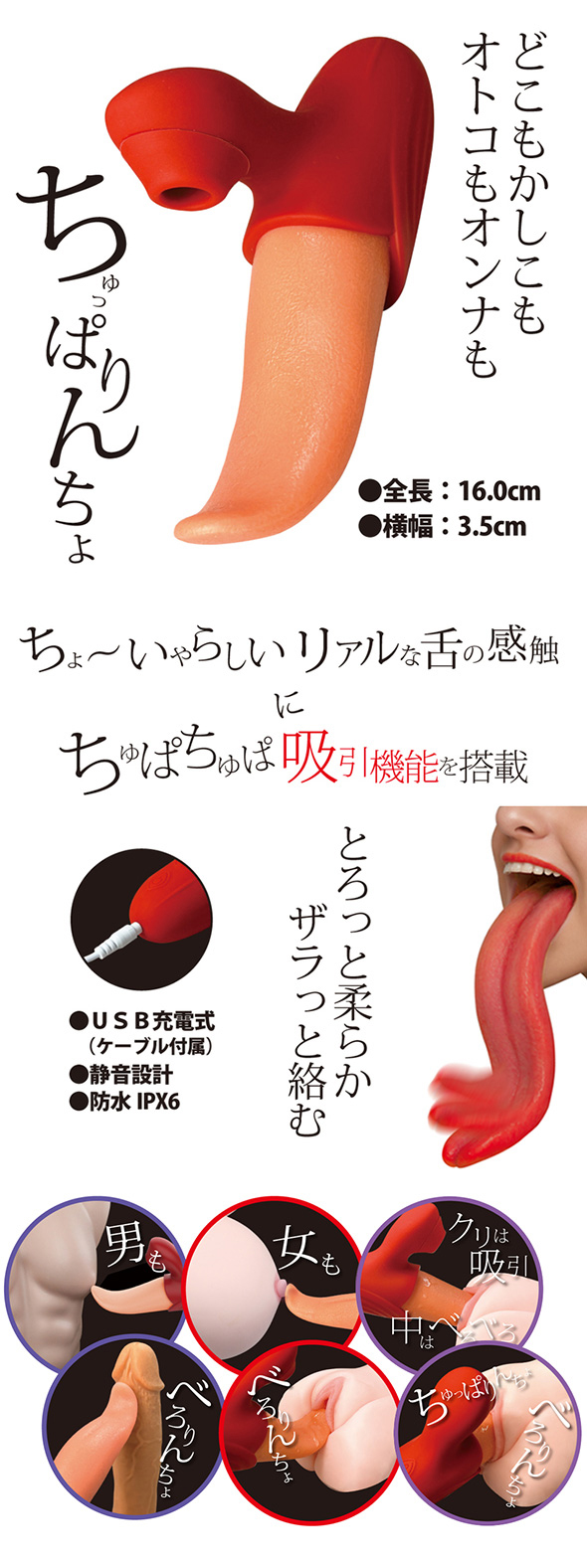 혀 파츠는 부드러운 수지 소재로 냄새와 끈적임이 없고, 신축성에도 우수합니다. 진동 기구의 중심이 내부 중간 정도까지 닿습니다.