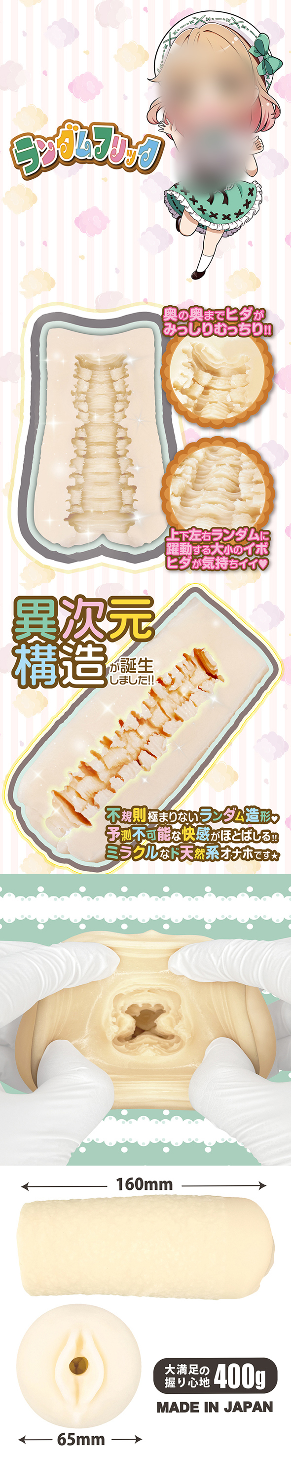 섬세한 주름과 블록같은 돌기, 스트로크 중 회전해도 되는 형태의 자극 구조로 만들어진 비관통 오나홀 제품, "랜덤 플릭"