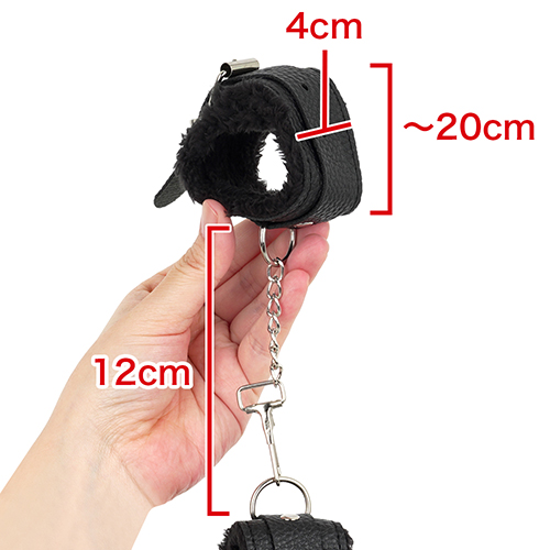 [핸드 커프스] 길이 30cm 폭 4.5cm 중량 45g. 손목 사이즈를 조정할 수 있고, D링이 붙어 있어 후크 체인으로 좌우 연결되어 있으며, 원터치로 간단하게 분리할 수 있습니다.