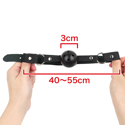 [볼 개그] 길이 60cm 폭 1.8cm 중량 27g. 호흡하기 쉬운 공기 구멍이 있는 볼 개그 타입으로, 벨트는 사이즈 조정이 가능합니다.