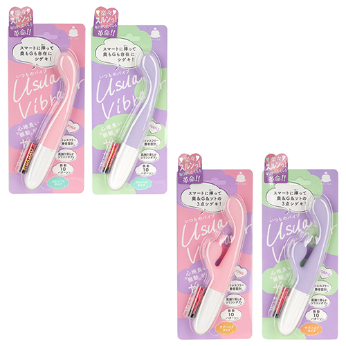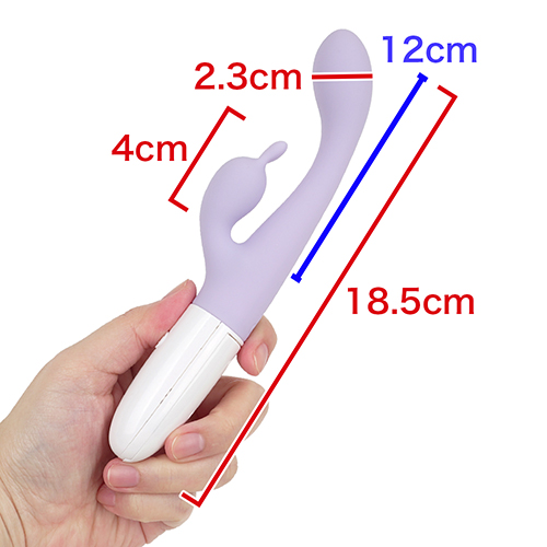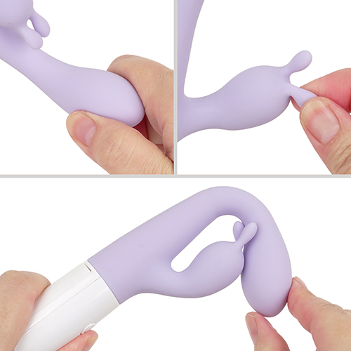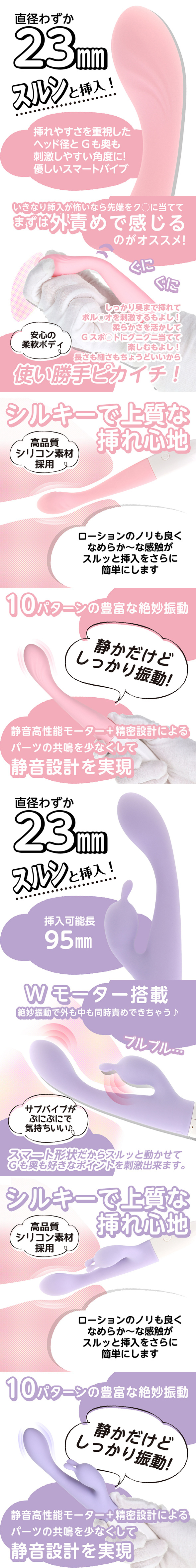 [03~04. 서브 포함 타입] 핑크와 퍼플 2색 컬러 중에서 고를 수 있는 건전지 구동 타입의 슬림 바이브로, 이쪽은 토끼 귀가 달린 서브 바이브 포함 타입! 메인 샤프트나 서브 바이브는 실리콘의 보송하고 매트한 감촉으로 삽입감도 좋습니다♪
