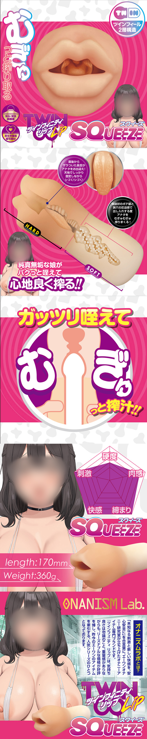장난스러운 혀로 확실히 물고, 끝부분을 부드럽게 감싸면서 천천히 짜내는… 넣고 뺄 때의 꽉꽉 끼는 느낌이 버릇이 되는, 착즙 홀입니다. 안쪽에서 공기를 밀어내듯 쥐면 더욱 밀착되어 진공감을 높여줍니다.