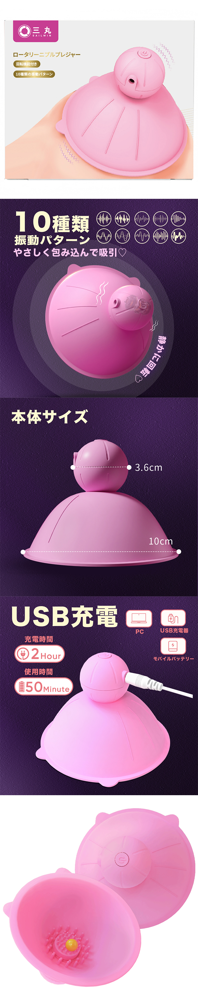 컵형 회전 마사지 타입의 유두 로터로, 컵 외측 버튼으로 조작하여 다양한 패턴 중에서 선택해 즐길 수 있습니다. 실리콘 컵은 부드럽고 피부 촉감도 매트하고 산뜻한 감촉입니다.