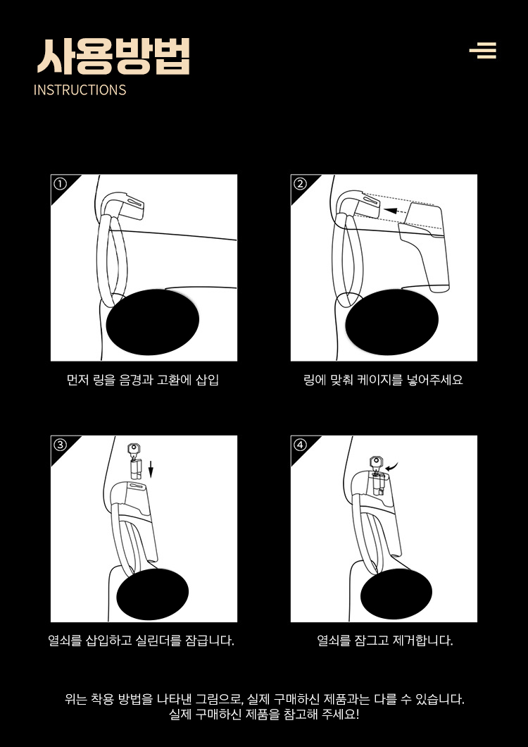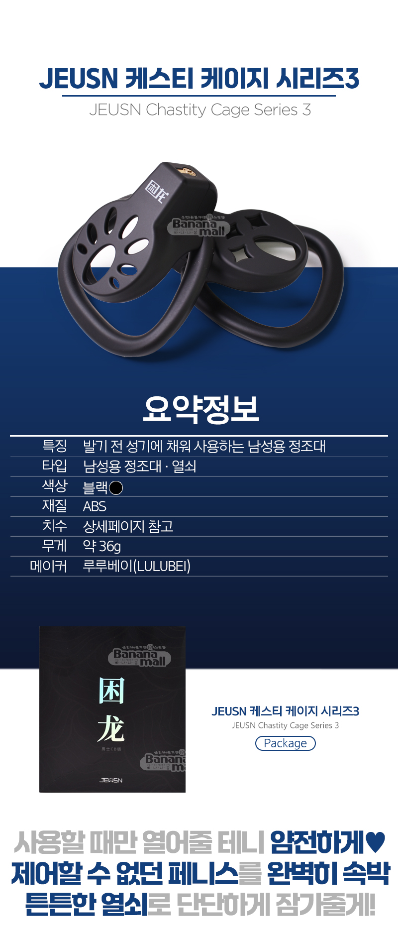 “JEUSN 케스티 케이지 시리즈”는 발기 전 성기에 씌워 사용하는 남성용 정조대 제품으로 견고하고 단단한 바디로 제작, 열쇠까지 동봉되어 하드한 구속감이 더욱 강렬하게 다가오는 아이템입니다.