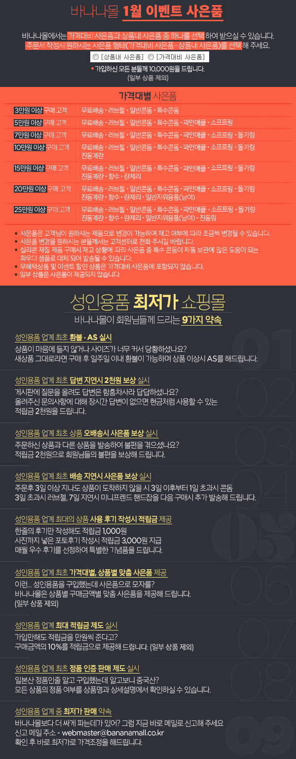 성인용품 바나나몰대표 : 송희원 (비앤앤컴퍼니) 주소 : (온·오프라인점) 경기도 의정부시 의정부 2동 496-4번지 IB타워 2층 주소 : (오프라인점) 서울시 강남구 청담동 31-29번지 사업자등록번호 : 613-81-81924 | 통신판매업신고번호 : 제 0491호 개인정보관리책임자 : 송희원([email protected])