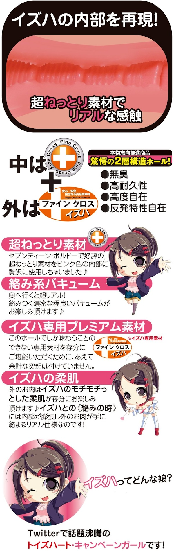 일본에서 발매 소식을 듣고 계속 기다리고 있었는데 드디어 찾았군요^^ 마스코트 캐릭터가 나오다니 ㄷㄷ 역시 토이즈하트 ㄷㄷ 재질도 일반 실리콘 같지 않고 사용감도 굉장히 만족스러웠습니다.