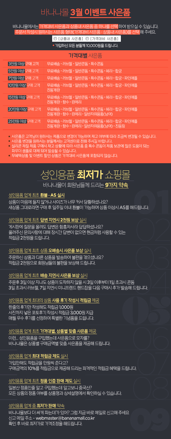 성인용품 바나나몰대표 : 송희원 (비앤앤컴퍼니) 주소 : (온·오프라인점) 경기도 의정부시 의정부 2동 496-4번지 IB타워 2층 주소 : (오프라인점) 서울시 강남구 청담동 31-29번지 사업자등록번호 : 613-81-81924 | 통신판매업신고번호 : 제 0491호 개인정보관리책임자 : 송희원([email protected])