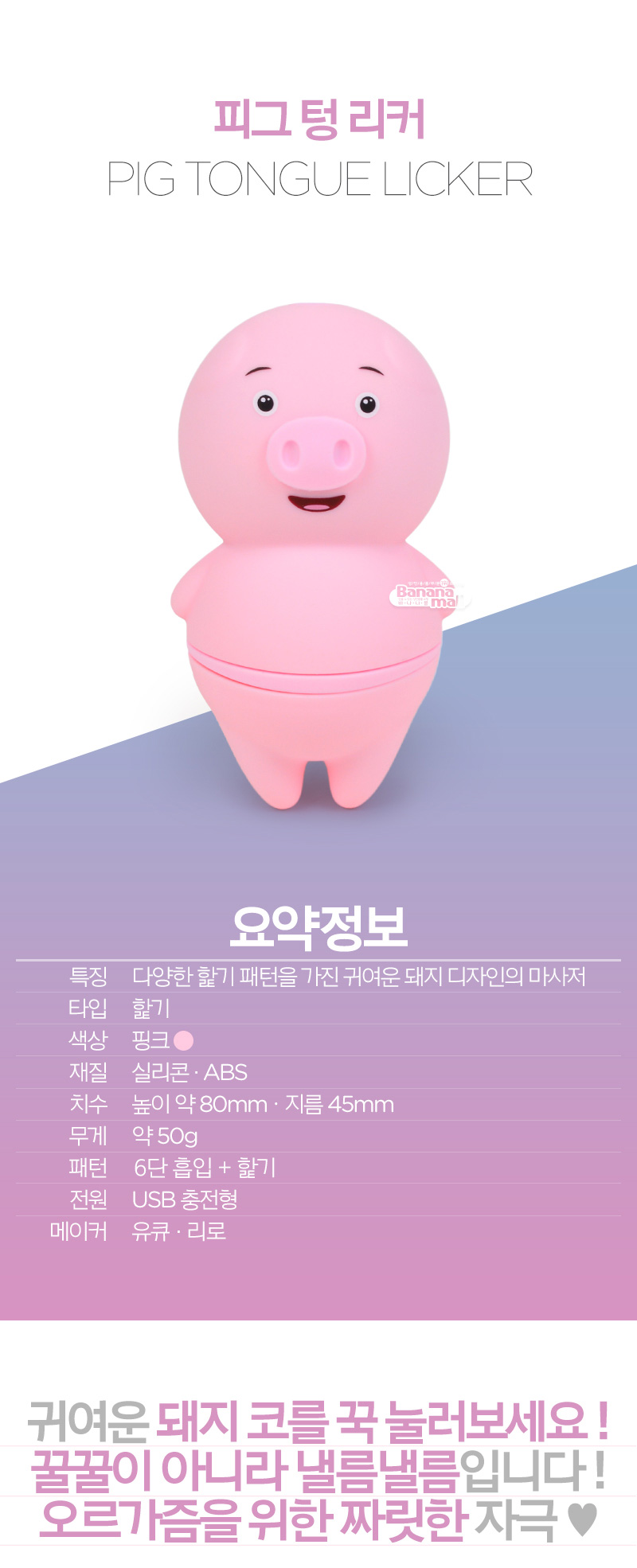 마치 만화 속 의인화된 돼지처럼 귀여움을 담아낸 디자인의 마사저입니다. 약간은 부담스러웠던 일반적인 어덜트 토이의 형태에서 벗어나 인테리어 소품으로 써도 매력적일만것 같습니다. 땡글땡글한 눈에 넓적한 코! 살짝 눌러보세요. 귀여움과는 조금 다른 짜릿한 자극으로 오르가즘을 전합니다.