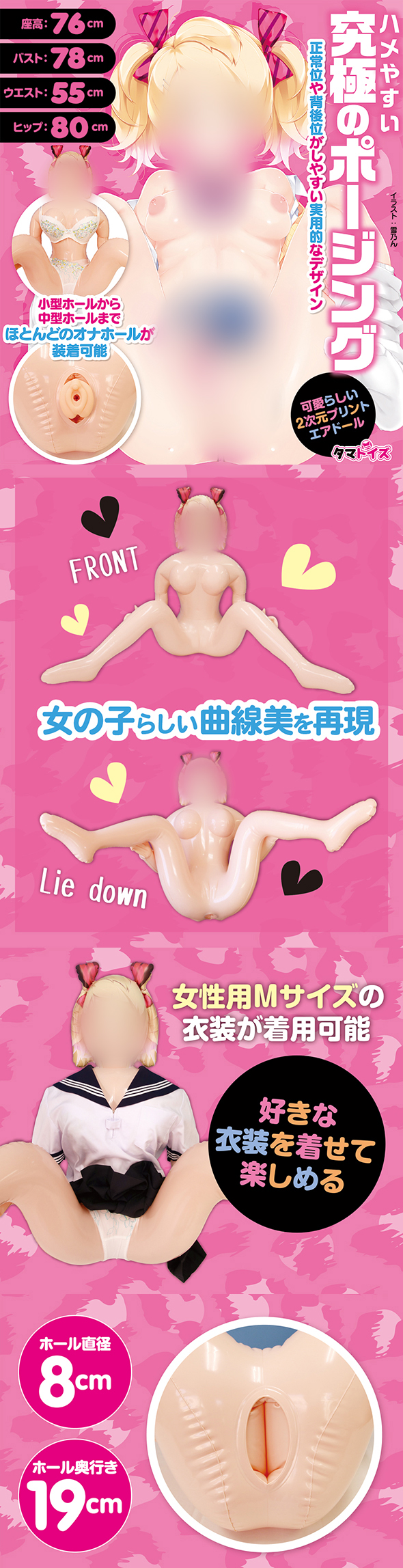 패키지의 내용물은 캐릭터 에어쿠션만 존재하며, 공기를 주입하게 되면 다리를 활짝 열고 있는 에로틱한 모습이 됩니다.
