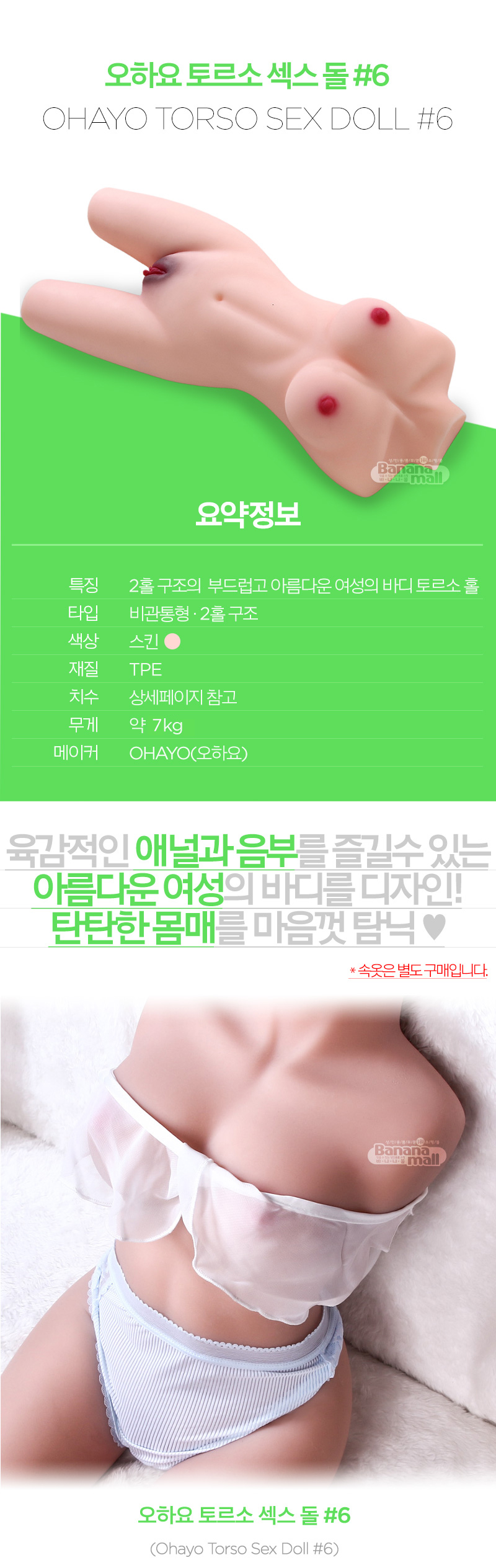 “오하요 토르소 섹스 돌 #6”은 매우 부드러운 촉감의 TPE 소재를 사용하여 민감한 점막에 부담을 주지 않고 위생적이고 실용적이게 사용이 가능합니다 . 또한 2개의 삽입구로 사용자에게 즐거움을 줍니다. 진짜 농밀하고 화끈한 쾌락에 흠뻑 젖고 싶으시다면 적극 추천합니다 !