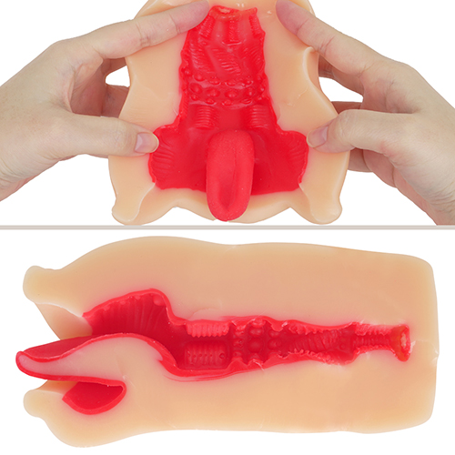 목구멍부터 시작되는 좁은 구멍은 약 1.5cm 직경의 타이트한 설계. 3방향에서 비벼대는 주름 벽, 돌기 링 3연속부터 다시 이어지는 주름 벽, 가장 안쪽에서는 알갱이들이 요도 부근을 자극하는 안쪽 벽이 기다리는 사정감이 높은 구조로 되어 있습니다.