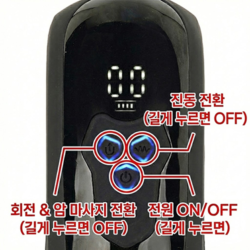 조작 패널의 숫자는 왼쪽이 회전 및 주무름, 오른쪽이 진동 패턴을 나타내며 하단에는 배터리 잔량이 표시됩니다. 플레이 중 패널 위치를 확인하며 조작하시기 바랍니다.