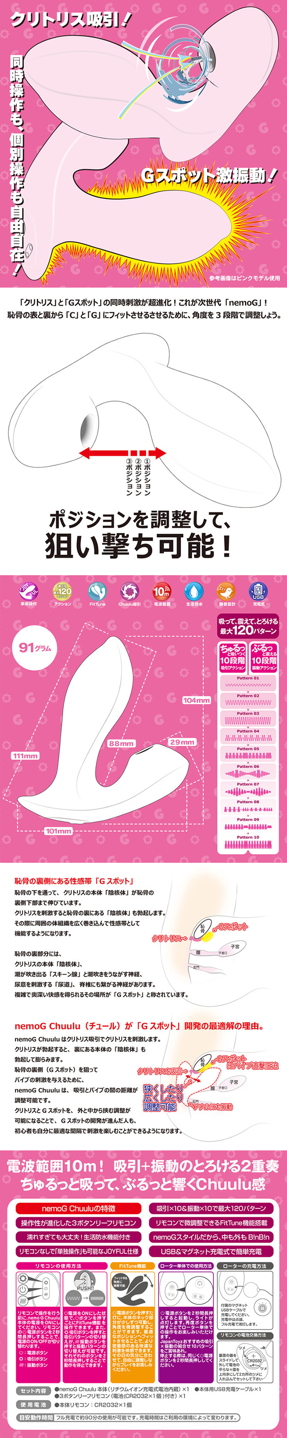 10종류의 액션 패턴을 탑재했습니다. 본체만으로 조작할 경우, 흡입과 바이브 진동의 개별 조작이나 각도 조정은 할 수 없습니다.